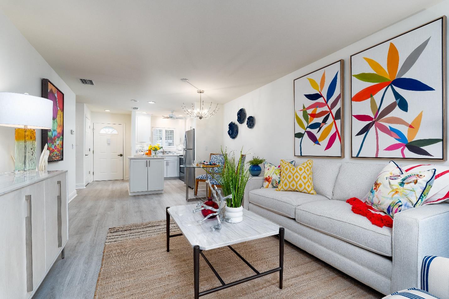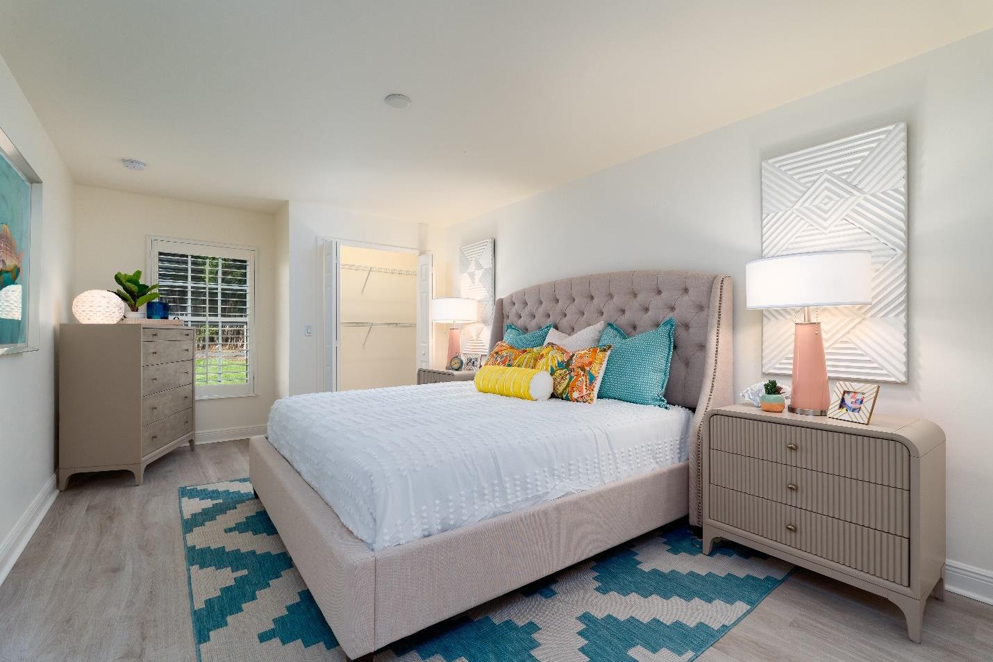 Anchored with oak laminate flooring and neutral furnishings, living areas are enhanced with colorful accessories, including an indigo-striped accent chair, vibrant wall art, and a cobalt blue chest. Linen, chenille, and wicker add textural interest, and a modern crystal and chrome chandelier illuminates the dining space. A pair of nightstands offering additional storage spaceflank a light taupe linen upholstered bed, while plantation shutters offer privacy throughout.